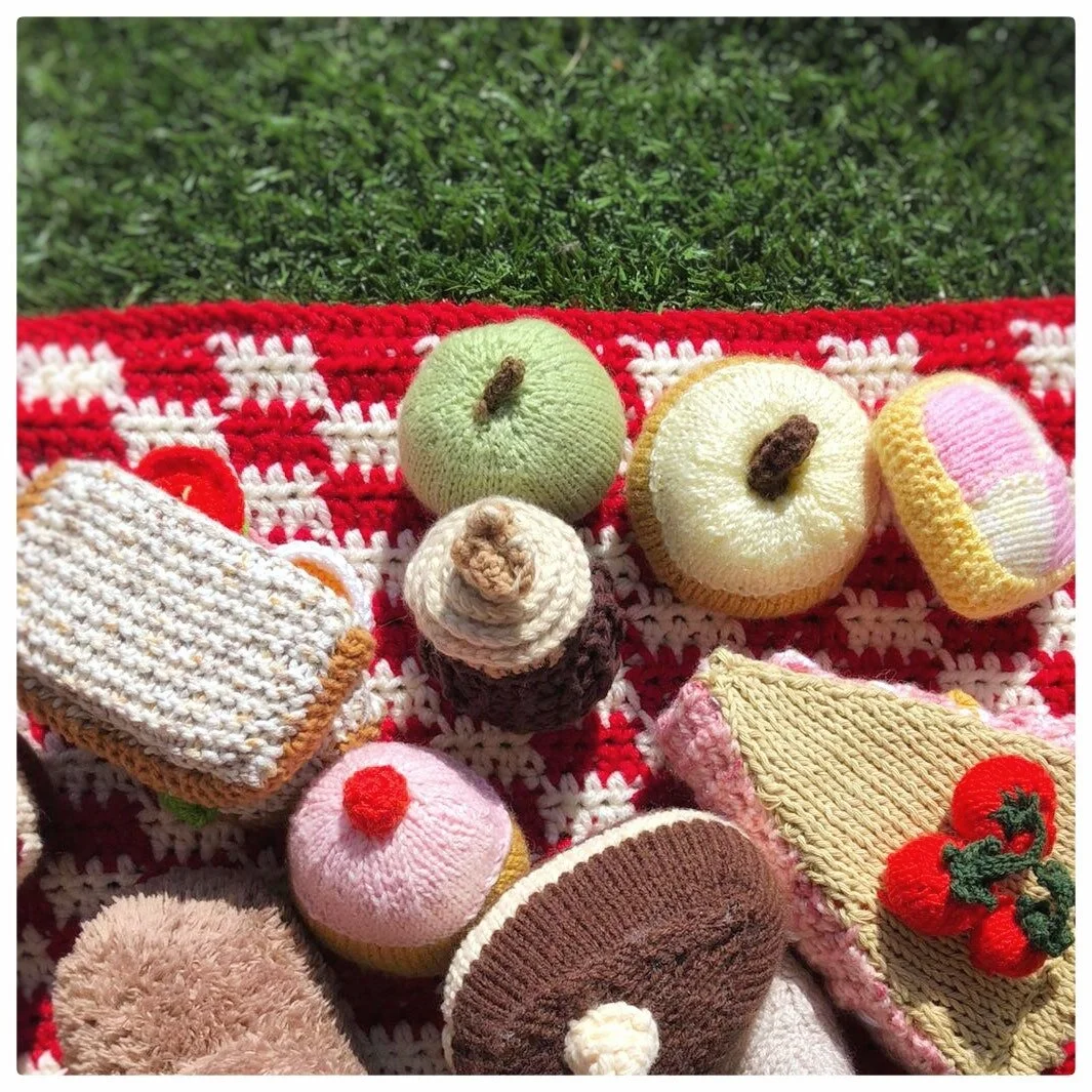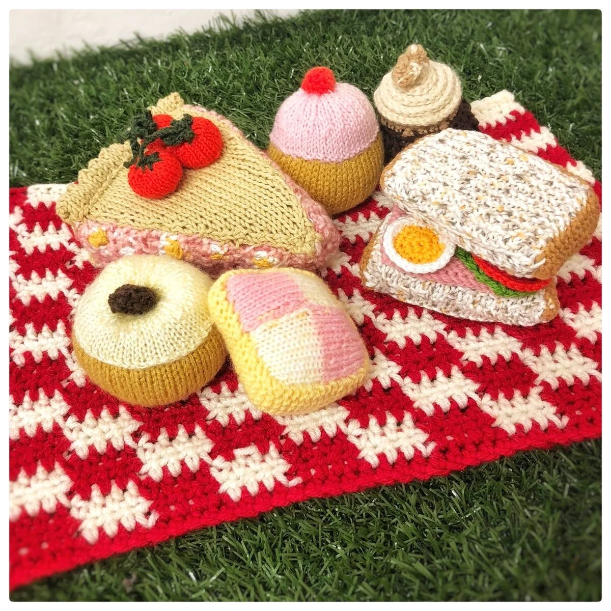 As for this delicious spread, these patterns came from a variety places. The battenburg cake is a favourite of ours from a Jean Greenhowe pattern book which you may remember from our Alice in Wonderland window. To make the bread, we used Dotti DK yarn by James C. Brett to give it a bit of texture and a wholewheat/ seeded bread effect. Yum!