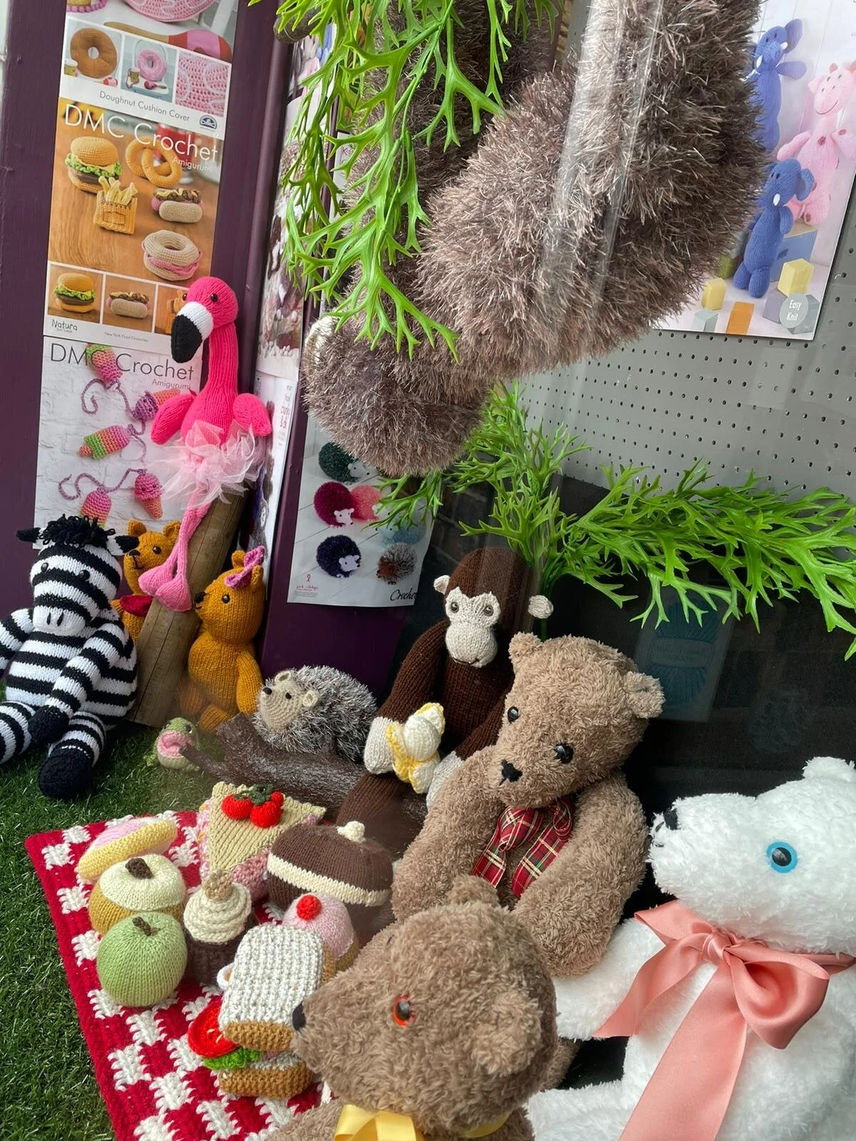 As well as the classic cuddly teddy bears (made with a King Cole Truffle yarn), we decided to add a twist and invite a few wild animals to the picnic. The sloth pattern is from King Cole and is knitted in Tinsel Chunky eyelash yarn. He’s been a favourite from this window so far, so we’ve decided to release a complete sloth knitting kit. It’ll be available from this week, along with a crochet hedgehog kit, if you’re interested in making your own!
